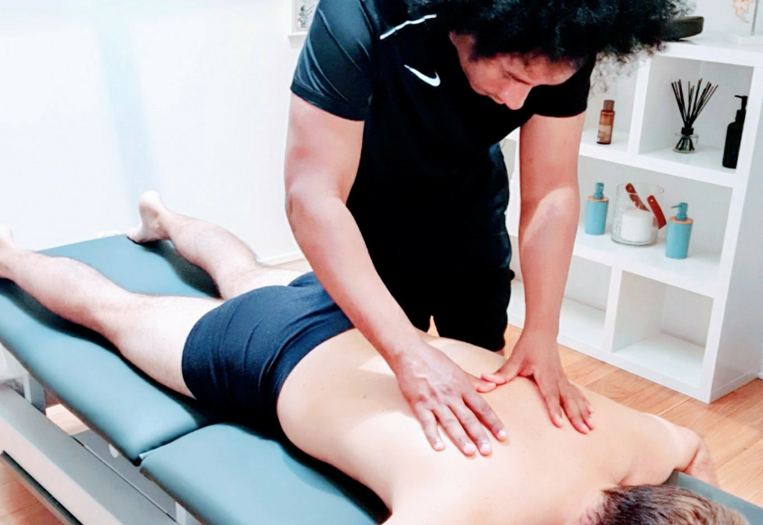 Una masajista vestida de negro le da un masaje de espalda a una persona que está boca abajo sobre una mesa. La habitación, con una luz tenue, cuenta con estantes blancos que contienen elementos decorativos y artículos, incluido un elegante purificador de agua, lo que crea una atmósfera de relajación y bienestar.