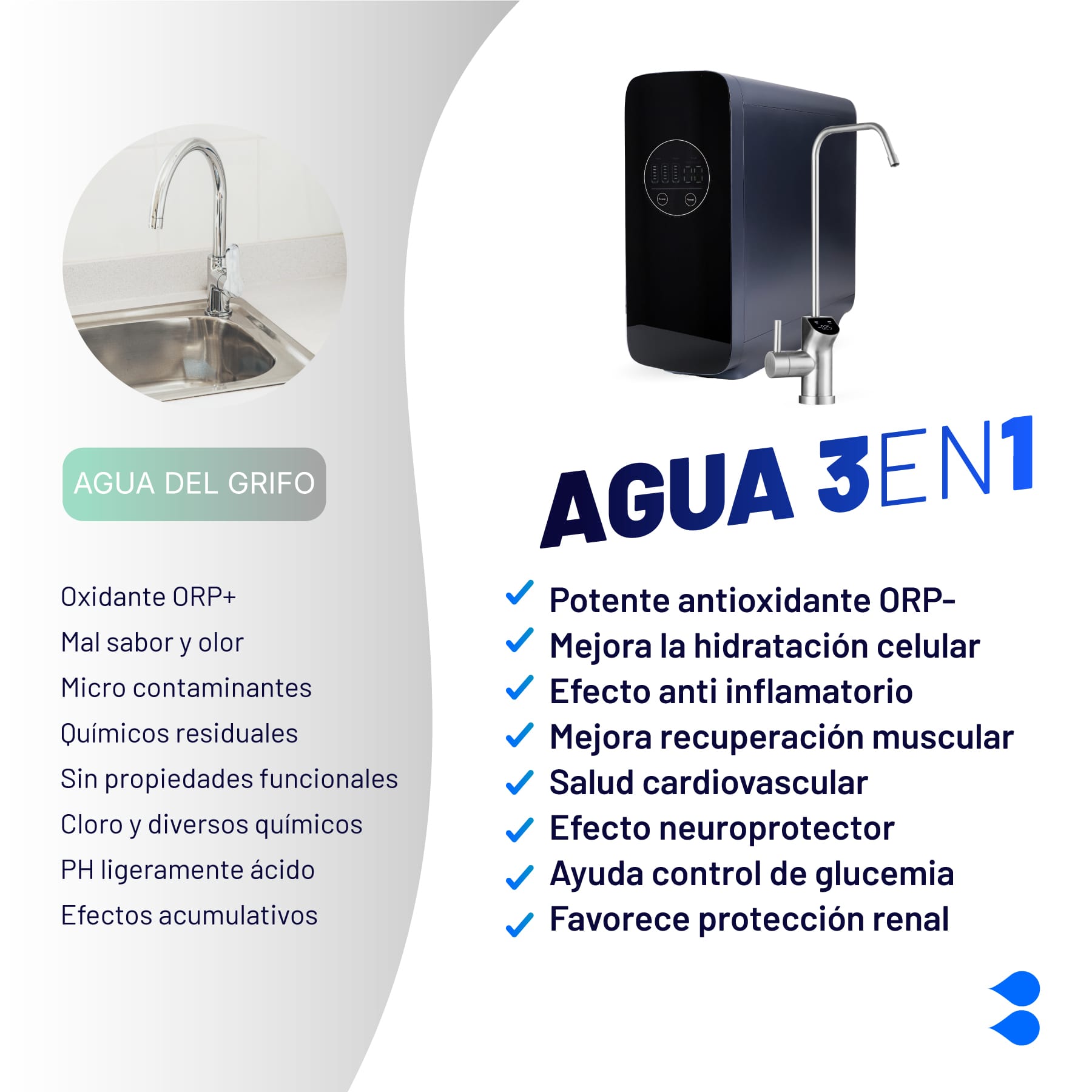 Agua libre de bacterias, metales pesados y otros contaminantes. Purifica, alcaliniza e hidrogena agua al instante, de una forma ilimitada. Además, permite ajustar el sabor del agua al paladar de cada persona.